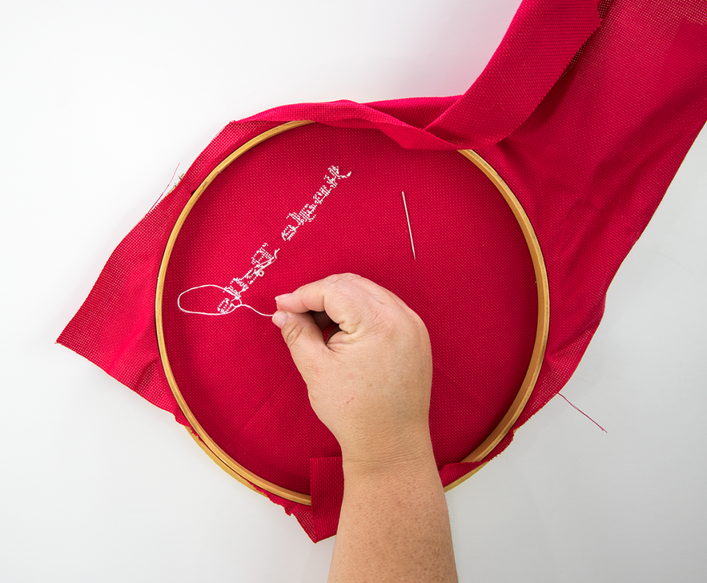 Remove the finished project from the hoop and trim the aida cloth to about 5″ from the stitching on all sides.