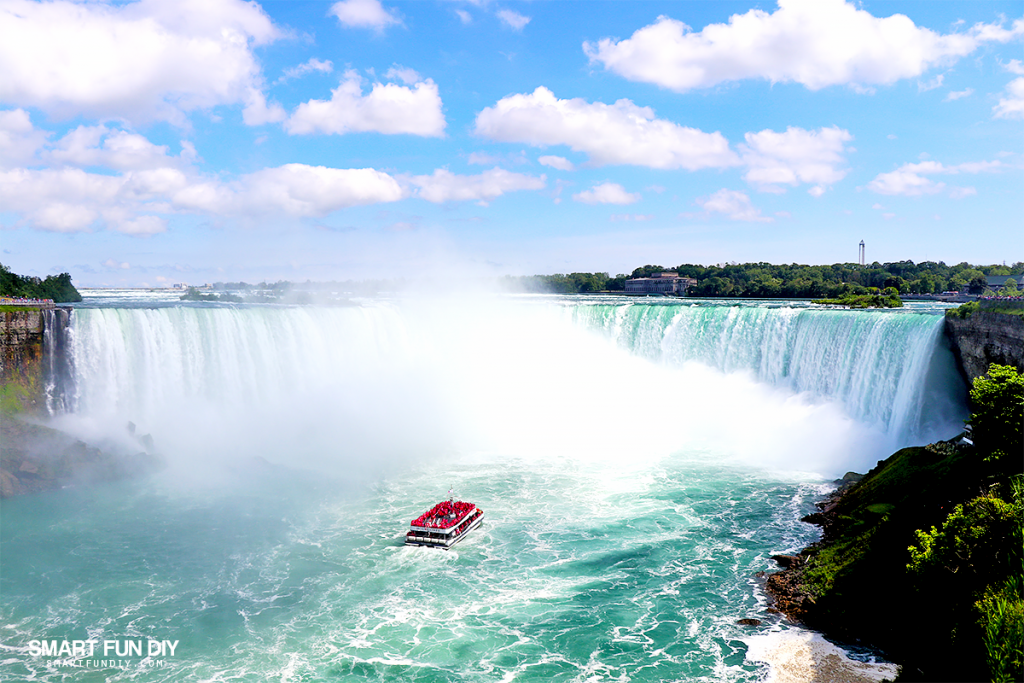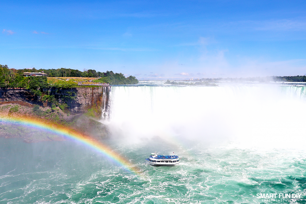 From the Canadian side, you can take a Hornblower tour. They give everyone a red poncho on the boat. Why do you need a poncho? Because you get SOAKED! I zoomed in on the boat riders with my phone and they are drenched and being blown all over the place from the wind down there. No thanks! (p.s. I show this on my vlog, which you can see at the end of this post).