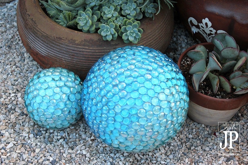 Whether you use rounds balls or use football shaped foam shapes, you can create gorgeous party decor by gathering a few of these glass orbs or DIY gazing balls on the table, in your team's colors. Plus, youย can get most of the supplies for these at the dollar store! These ones were in my garden but they hold up much better inside and look great along the floor, on a table top, or as centerpieces.
