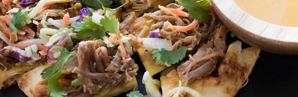 I recently watched “City of Gold”, a Sundance finalist documentary about food writer and critic Jonathan Gold. The movie documents his journey to becoming a food writer, his love of the melting pot of Los Angeles cuisine, and the evolution of southern California's new culinary story. This is where chef Roy Choi got his start, creating Kogi taco trucks, right?! The fusion of different cuisines into something new is now a part of daily California culture and cuisine. So when we saw Stonefire Naan flatbreads in the bakery section at the store, southern style pulled pork seemed like a totally perfect topping! We knew theย soft naan flatbread would be delicious spread with a homemade mustard sauce, buttery tender pulled pork, and crisp coleslaw.